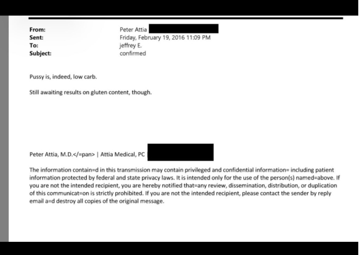 The DOJ just released a new stash of Epstein files. There are multiple emails between Dr. Peter Attia and Jeffrey Epstein discussing medical matters, travel, and other things, such as “Pussy is, indeed, low carb.”
