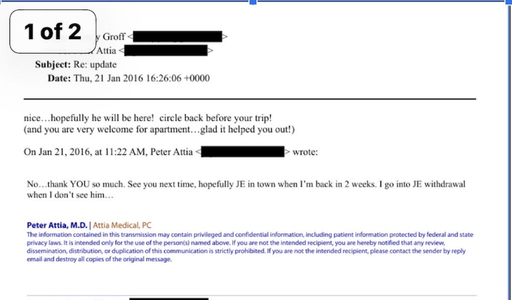In one email, it is stated that Attia, who we know to be a grown man and a doctor, goes into “JE withdrawal when I don’t get to see him….”