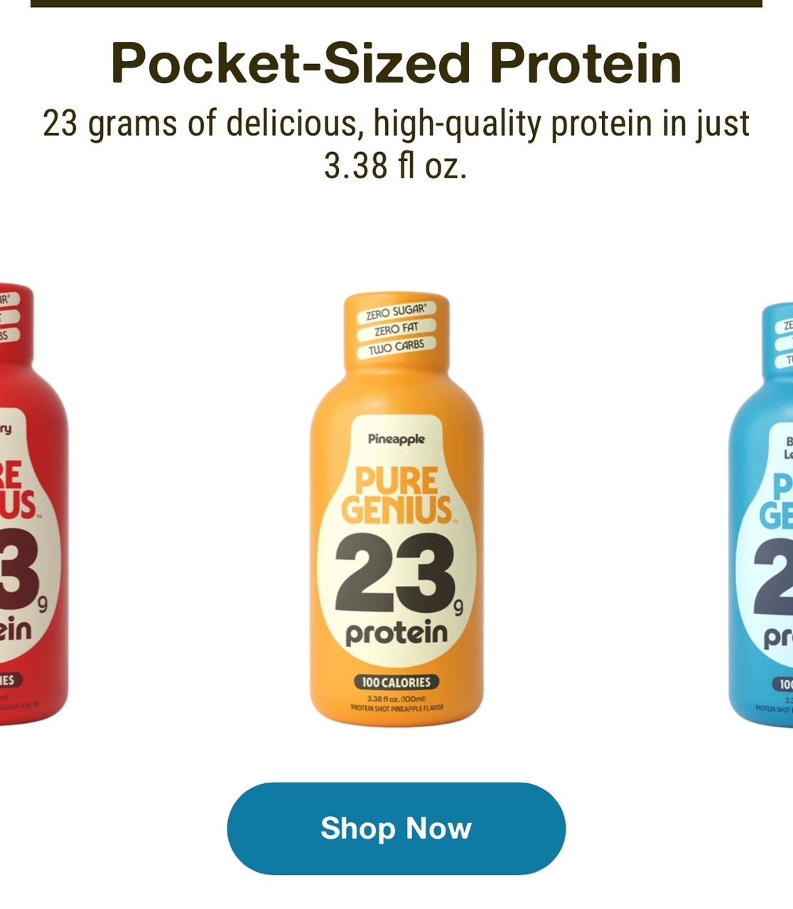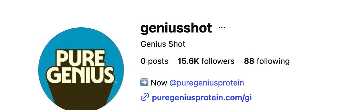 I get that it is standard marketing hyperbole for brands to claim their product, be it jeans or bras or massive-lash mascara or whatever is UNLIKE ANYTHING ELSE. But it’s quite a flex to claim that your 23 g protein shot is so novel that it is “unlike any other protein,” and yet be very much like a 23 g protein shot that was introduced in March of 2025, called Genius Shot. So similar, in fact, that the old Instagram account for Genius Shot directs to Pure Genius Protein.
