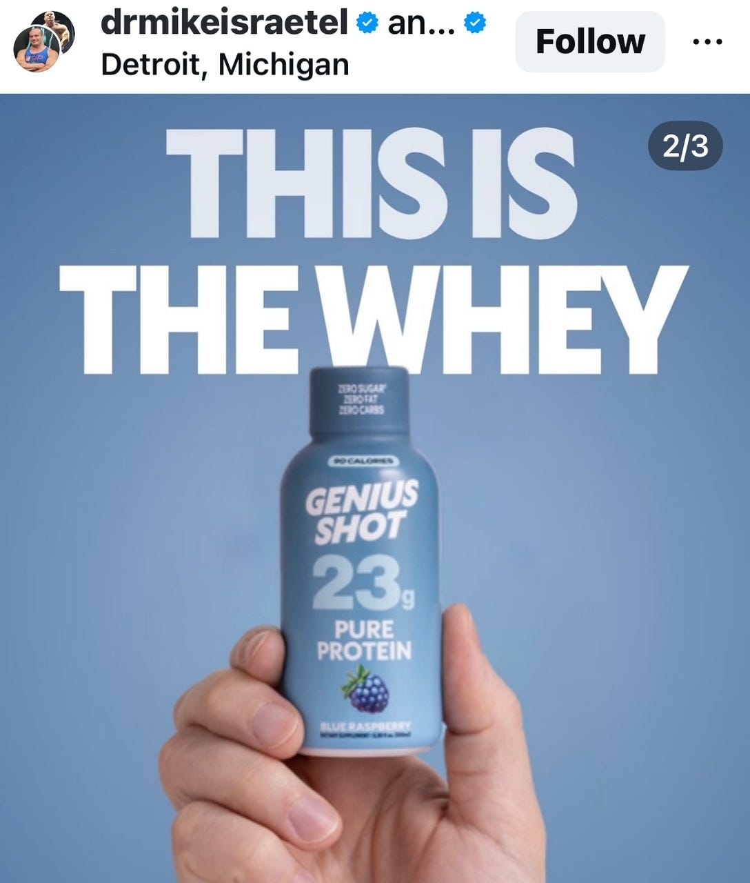 I was first alerted to this by Beth Wilkas Feraco (a great follow on Instagram, you can find her here), but many others soon chimed in wondering how Pure Genius, by Mel Robbins, was substantively different from Genius Shot, by Dr. Mike Israetel? I went over to Dr. Israetel’s Instagram, and sure enough, this is a post of his from March 2025: 23 g of complete protein in about 3 ounces.