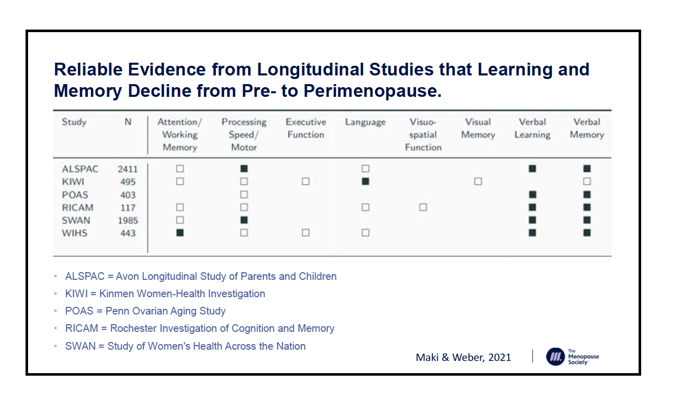 I know that many aspects of menopause are understudied, but there are at least six longitudinal studies that have evaluated cognitive changes, and two changes emerge as being consistently related to the menopause transition/early menopause: verbal learning and verbal memory. It’s also important to know that for most women these changes are reversible. Here is the slide that lists those studies, as well as the numbers of participants
