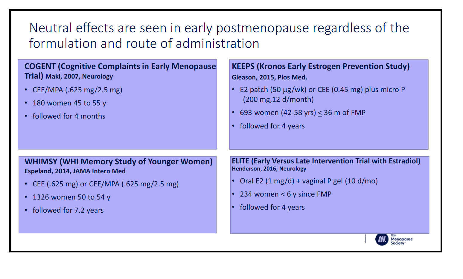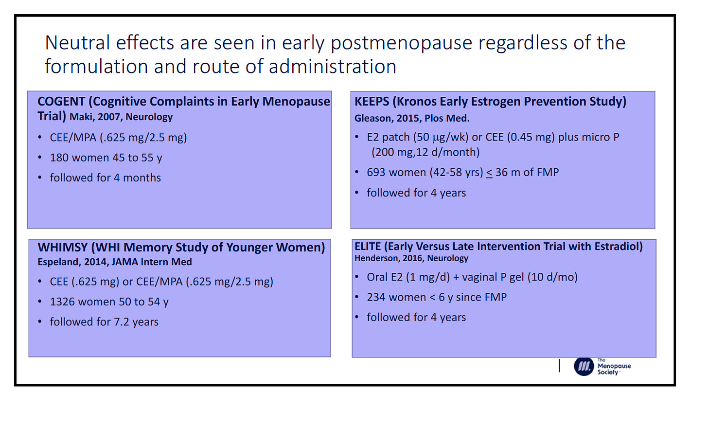 including oral and transdermal therapy, and Premarin and estradiol. The studies are COGENT, ELITE, WHIMSY, and KEEPS and there was no benefit for cognition with any of the regimens.