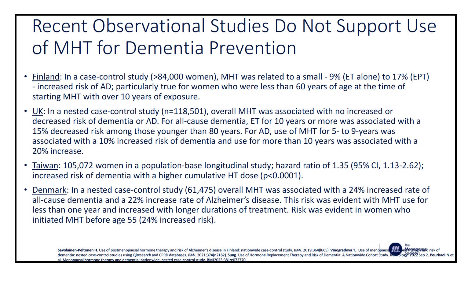 There are quite a few observational studies that suggest a small risk of dementia from taking menopause hormone therapy. I’ve included the salient slide below so you can see the studies (also easier than me typing out all of the references). This was referred to as a “reliable signal in the epidemiological literature as a small risk of harm.” This is shown in data from multiple countries looking at different formulations and looking at starting the therapy early vs late in menopause.