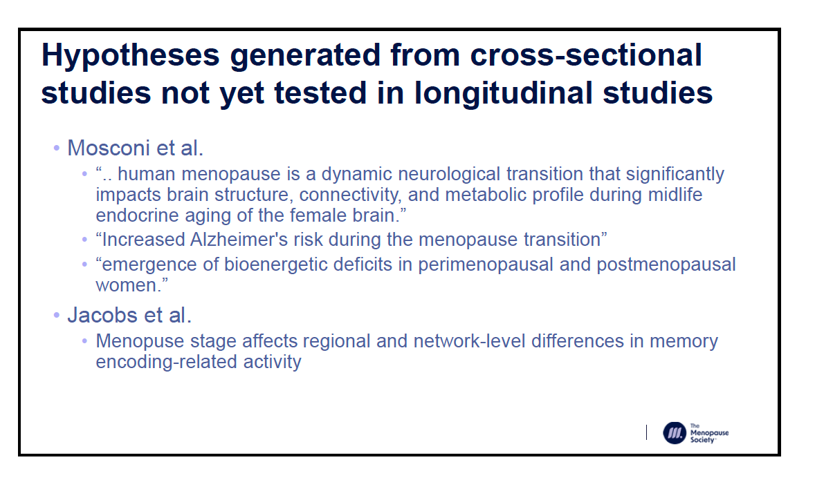 There was a review of some of the cross sectional brain imaging studies, which look at the impact of menopause on human brain structure, connectivity, energy metabolism, and amyloid beta deposition. These include some of the studies that have been amplified in the media and on social media that have frightened many women. Some meno-influencers have claimed these studies are proof that women’s brains will shrink and crumble without hormone therapy. It is clear from the data presented that we should not be making those conclusions.