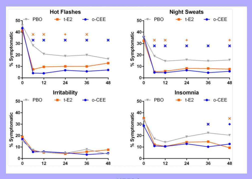 I know influencers and doctors hype testosterone online and in the office, but I don’t see these results in my practice. In fact, I do a lot of testosterone de-prescribing of people who have been on it for some time and and are clearly not getting the desired result. It’s important to remember that many medications we use in perimenopause and menopause have a very robust placebo response. I always show this slide from KEEPS when I am giving talks, as it shows the impact of both of the estrogen arms (transdermal estradiol and Premarin) as well as the placebo arm, and durable nature of the placebo response. In every metric there is drastic placebo response, and for irritability, estrogen and the placebo were indistinguishable for 48 months! About a 75% improvement!